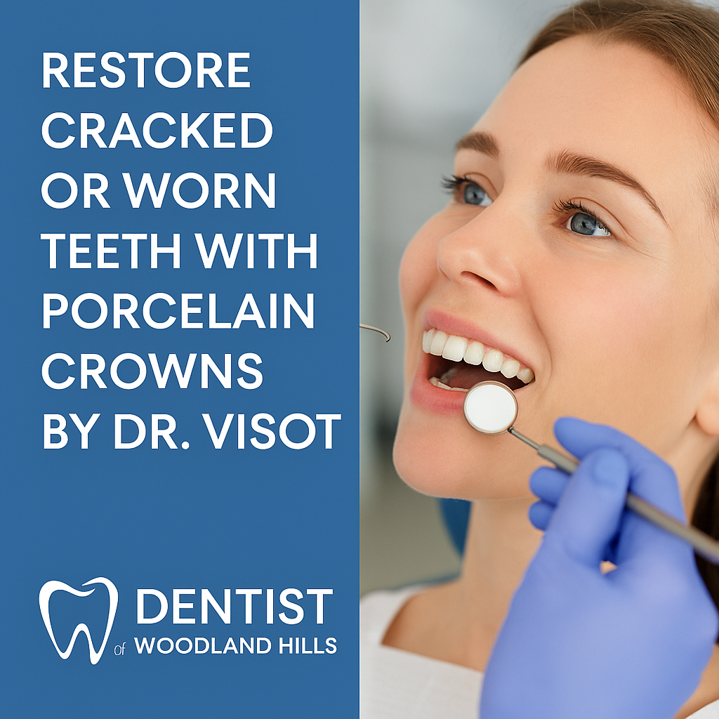 🔑 Key Highlights What are porcelain crowns? Why cracked or worn teeth need crowns Benefits of porcelain crowns Step-by-step treatment process Porcelain crowns vs. other materials Maintenance and care tips Why choose Dr. Visot in Woodland Hills FAQs about porcelain crowns What Are Porcelain Crowns? Porcelain crowns are tooth-shaped caps made from high-grade ceramic that […]